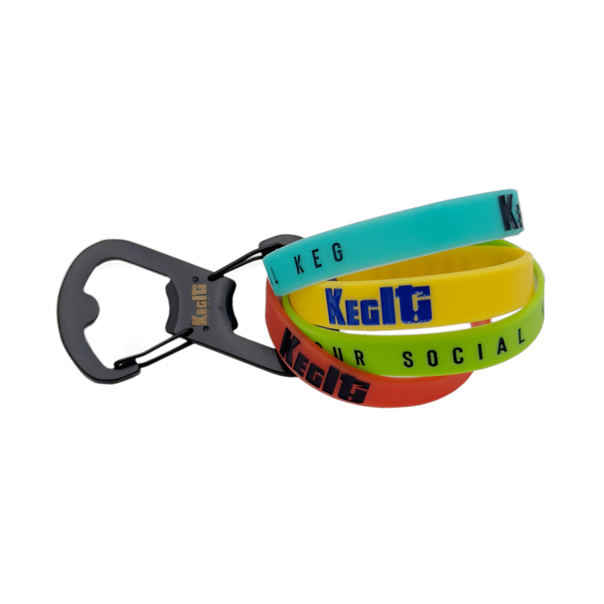 From backyard BBQs to lakeside tailgates, the Keg It® Beverage Bands & Carabiner Set keeps your drinks marked, your bottles open, and your party on point.